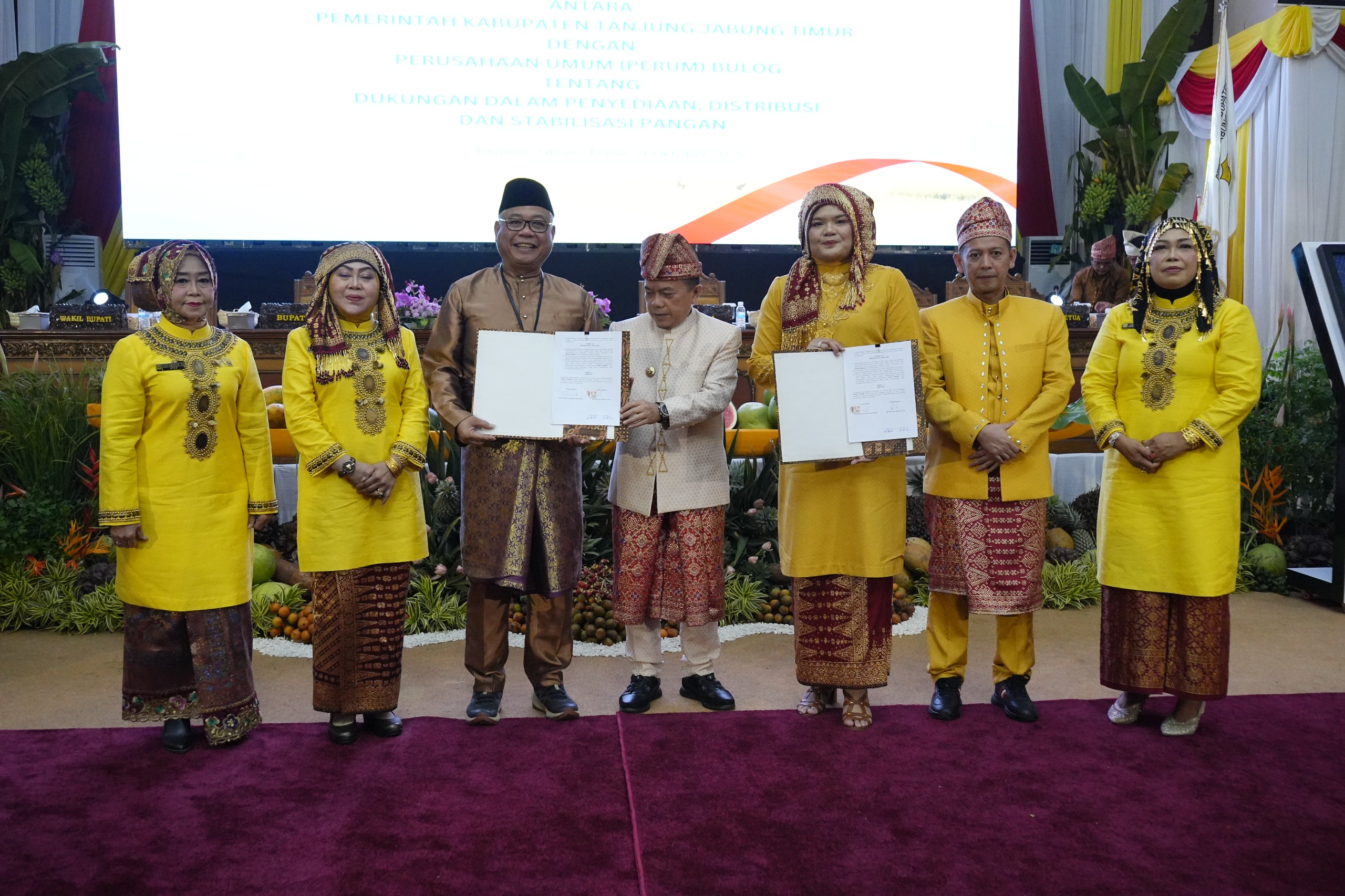 Selain itu, dalam rangkaian acara juga dilakukan penandatanganan nota kesepakatan antara Pemerintah Kabupaten Tanjung Jabung Timur dan Perum Bulog Pusat terkait penyediaan serta stabilisasi pangan, yang disaksikan langsung oleh Gubernur Jambi, Bupati, dan Ketua DPRD.