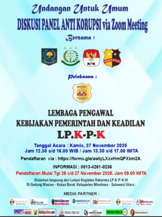 Melgisdays.com|Minahasa- 25 November 2025 — Dalam rangka mendukung penguatan gerakan antikorupsi di Indonesia, Lembaga Pengawal Kebijakan Pemerintah dan Keadilan (LPKPK) mengundang masyarakat luas untuk mengikuti Diskusi Panel Anti Korupsi yang akan dilaksanakan secara daring melalui Zoom Meeting pada Kamis, 27 November 2025.